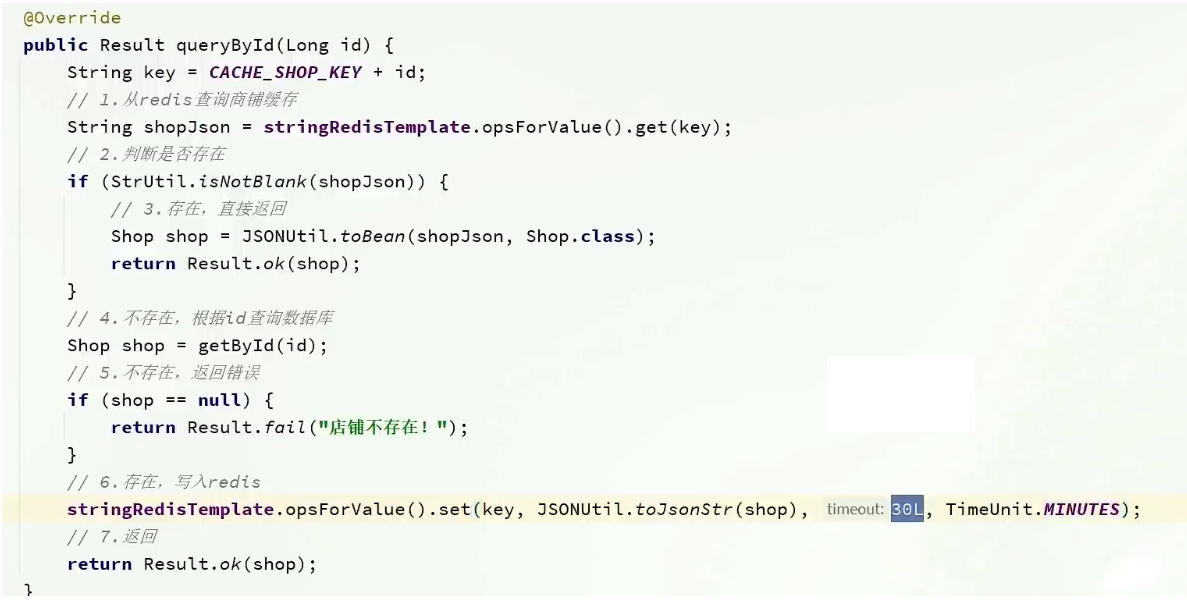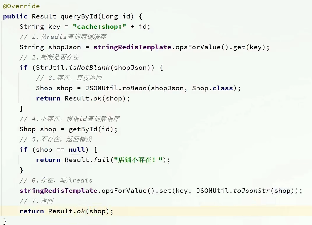 1 2 3 4 5 6 7 8 9 10 11 12 13 14 15 16 17 18 19 20 21 22 23 @Resource private CacheClient cacheClient; @Override public Result queryById (Long id) { Shop shop = cacheClient .queryWithPassThrough(CACHE_SHOP_KEY, id, Shop.class, this ::getById, CACHE_SHOP_TTL, TimeUnit.MINUTES); if (shop == null ) { return Result.fail("店铺不存在!" ); } return Result.ok(shop); }