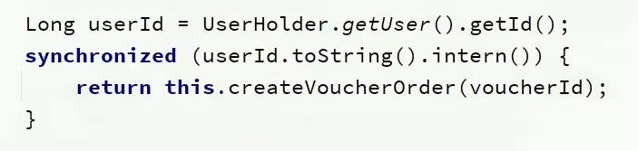 | synchronized (userId.toString().intern()) { IVoucherOrderService proxy = (IVoucherOrderService) AopContext.currentProxy(); return proxy.createVoucherOrder(voucherId); }
