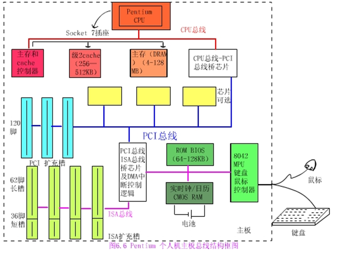 • ISA总线:与低速的I/O设备连接,支持7个DMA通道和15级可屏蔽硬件中断,并通过片级总线和ROM、键盘鼠标控制器等相连。