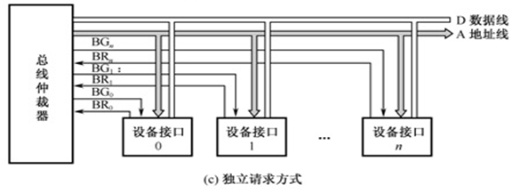 在独立请求方式中,每一个共享总线的主设备均有一对总线请求线BRi和总线授权线BGi。当设备要求使用总线时,便发出该设备的请求信号。总线仲裁器中有一个排队电路,它根据一定的优先次序决定首先响应哪个设备的请求,给设备以授权信号BGi。当代总线标准普遍采用独立请求方式。
