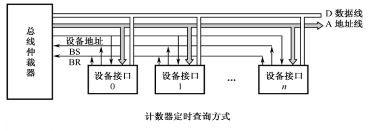 总线上的任一设备要求使用总线时,通过BR线发出总线请求。中央仲裁器接到请求信号以后,在BS线为“0”的情况下让计数器开始计数,计数值通过一组地址线发向各设备。每个设备接口都有一个设备地址判别电路,当地址线上的计数值与请求总线的设备地址相一致时,该设备置“1”BS线,获得了总线使用权,此时中止计数查询。 每次计数可以从“0”开始,也可以从中止点开发始
