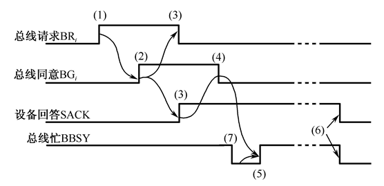 在总线“忙”标志BBSY为“0”情况该设备上升BBSY,表示该设备获得了总线控制权,成为控制总线的主设备(5)。