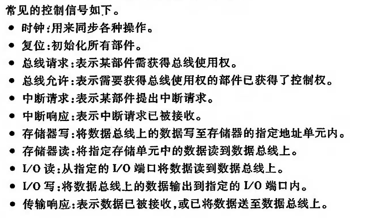 • 公用线:包括时钟信号线、电源线、地线、系统复位线以及加电或断电的时序信号线等。