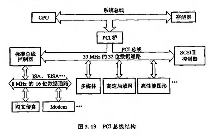 由图3.13中可见,PCI总线是通过PCI桥路(包括PCI控制器和PCI加速器)与CPU总线相连。这种结构使CPU总线与PCI 总线互相隔离,具有更高的灵活性,可以支持更多的高速运行设备;而且具有即插即用的特性。当然,挂在PCI总线上的设备都要求数据传输速率高的设备,如多媒体卡,高速局域网适配器、高性能图形卡等,与高速CPU总线是相匹配的。至于低速的FAX、Modem.打印机仍然挂在ISA、 EISA总线上。