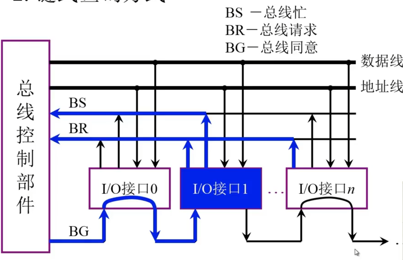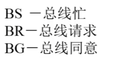 所有设备通过BR发出申请总线的信号,总线控制部件通过BG线授予某个设备总线控制权,该设备通过BS先发出总线被占用的信号。