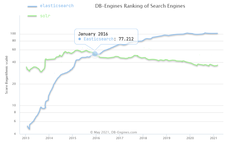 虽然在早期,Apache Solr是最主要的搜索引擎技术,但随着发展elasticsearch已经渐渐超越了Solr,独占鳌头: