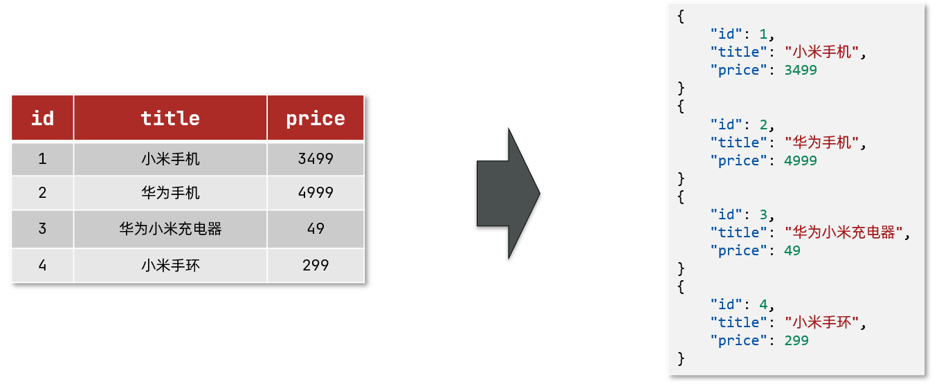 而Json文档中往往包含很多的字段(Field),类似于数据库中的列。