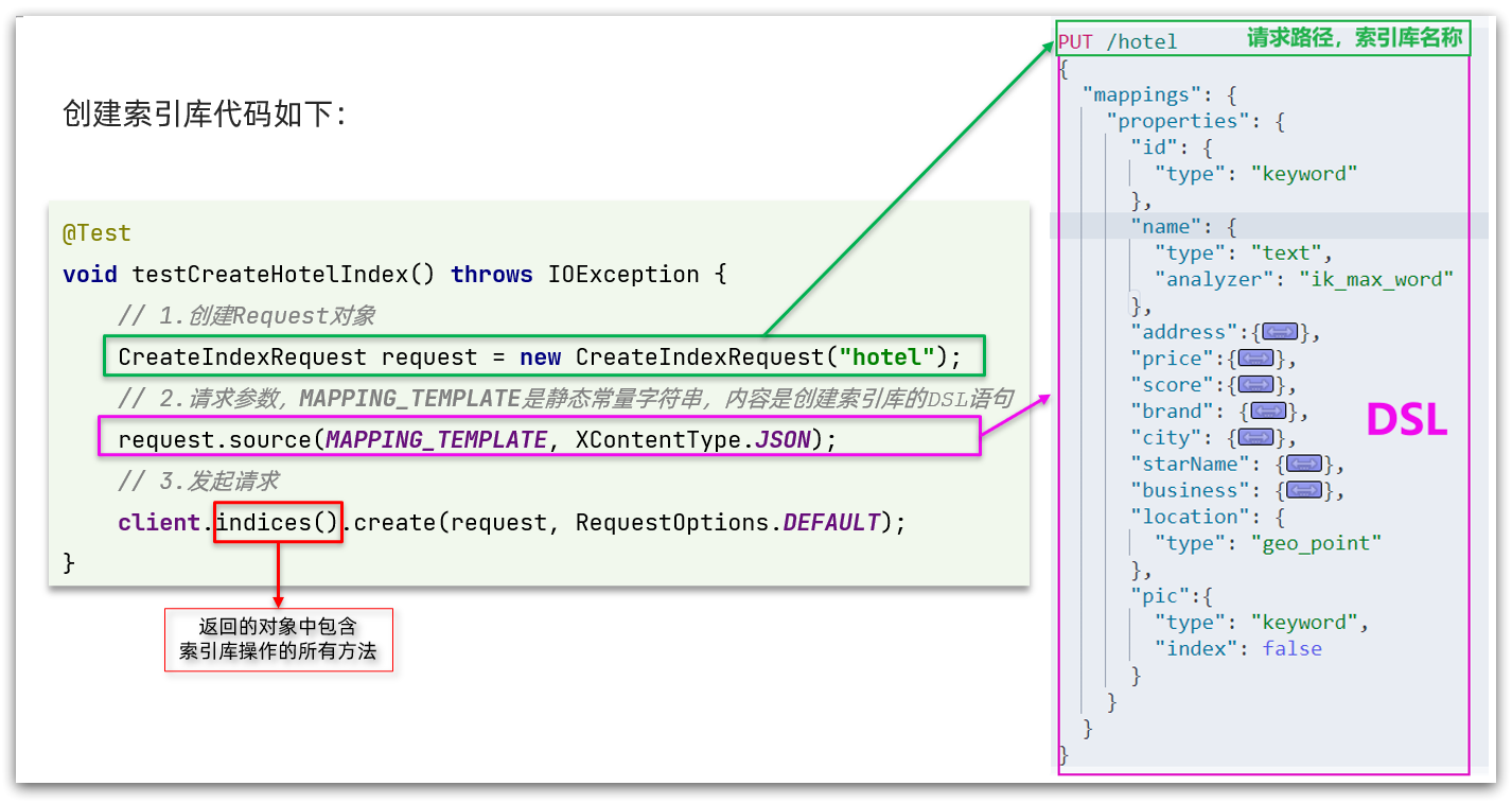 - 发送请求。调用RestHighLevelClient#indices().xxx()方法,xxx是create、exists、delete