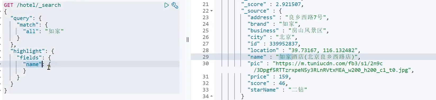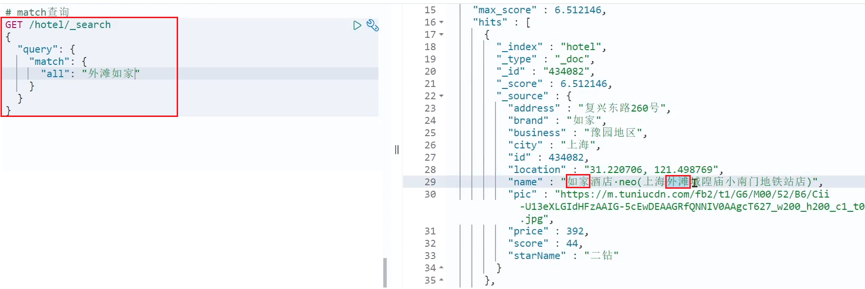private PageResult handleResponse(SearchResponse response) { SearchHits searchHits = response.getHits(); long total= searchHits.getTotalHits().value; SearchHit[] hits = searchHits.getHits(); List<HotelDoc> hotels= new ArrayList<>(); for (SearchHit hit : hits) { hotels.add(JSONUtil.toBean(hit.getSourceAsString(),HotelDoc.class)); } return new PageResult(total,hotels); } }