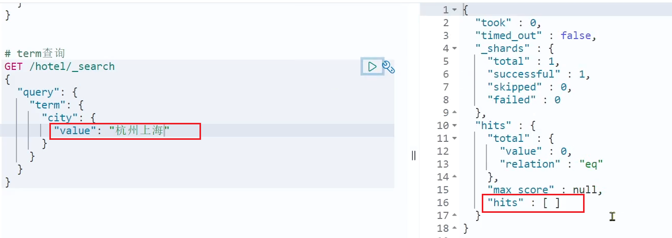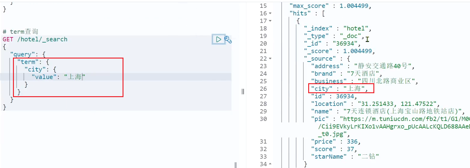 - 城市过滤:是keyword类型,用term查询