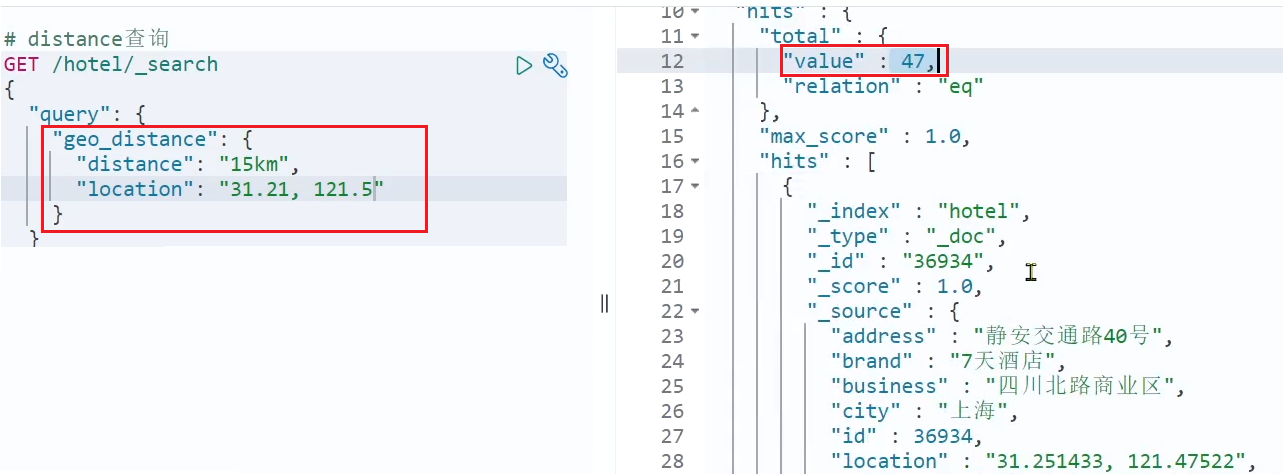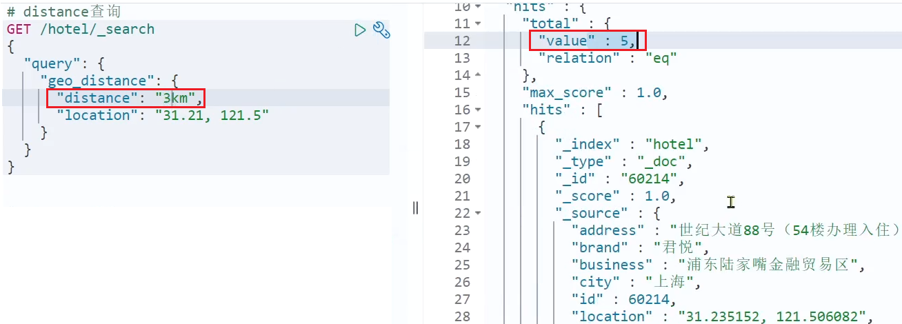 因此,我们在结果解析阶段,除了解析source部分以外,还要得到sort部分,也就是排序的距离,然后放到响应结果中。