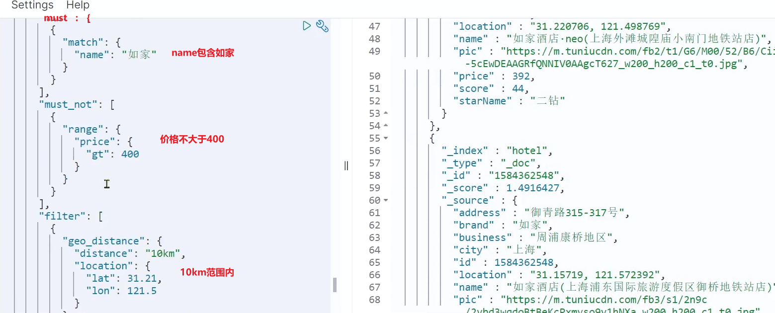 我们可以将之前写的boolean查询作为原始查询条件放到query中,接下来就是添加过滤条件、算分函数、加权模式了。所以原来的代码依然可以沿用。