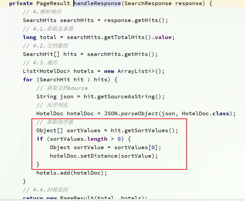 - 修改HotelService类中的handleResponse方法,添加对sort值的获取
