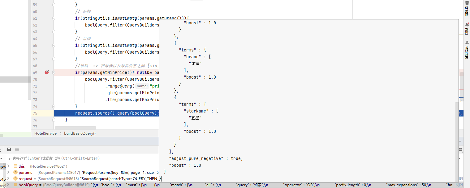 在HotelService的search方法中,只有一个地方需要修改:requet.source().query( … )其中的查询条件。